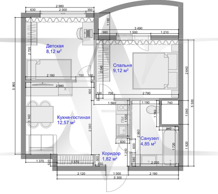 Планировочное решение предусматривает: Кухню-гостиную 19 м2, взрослая спальня с гардеробной, 2 детские комнаты с возможностью размещения учебной или игровой зоной, 1 санузел раздельный, 1 гардеробная.