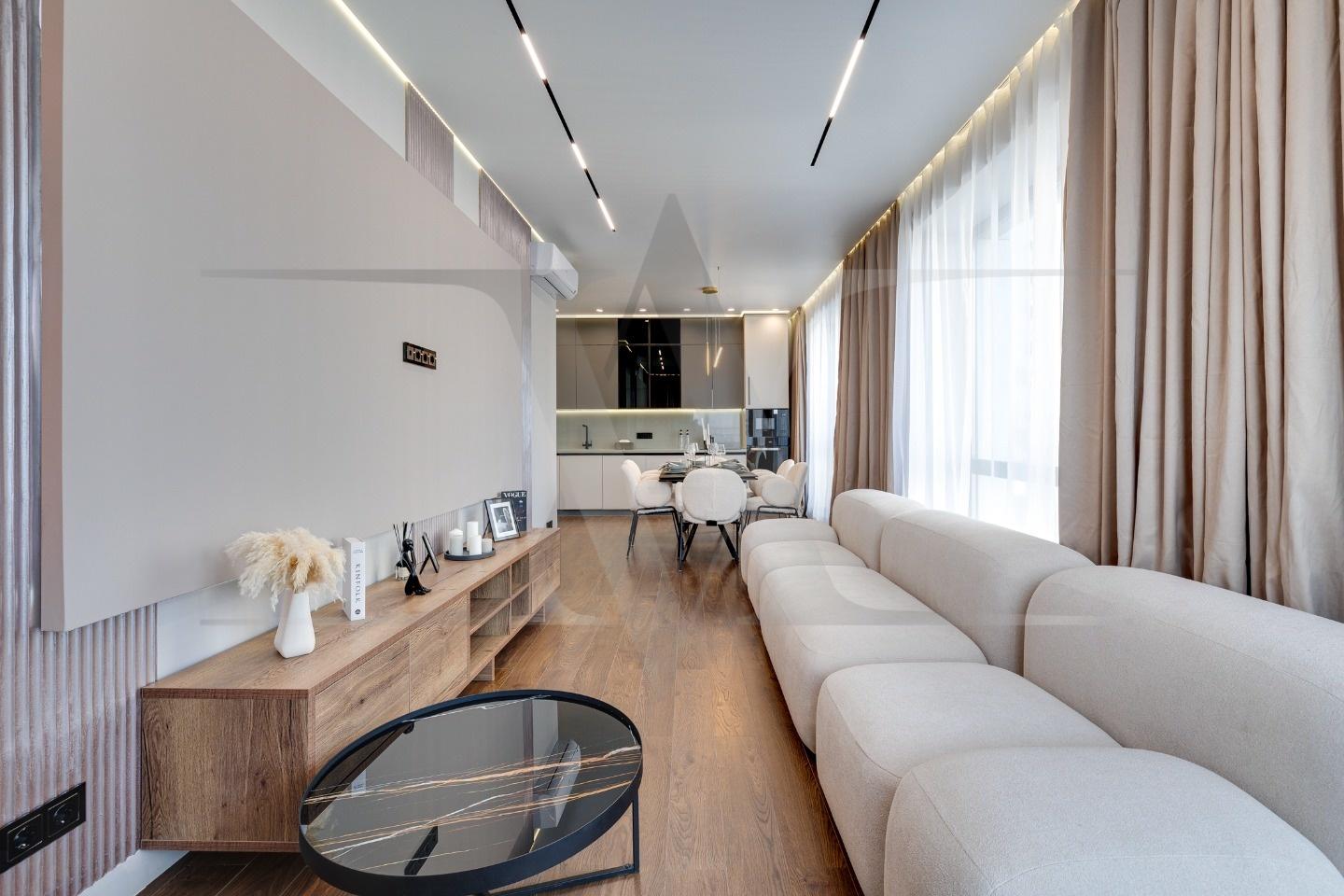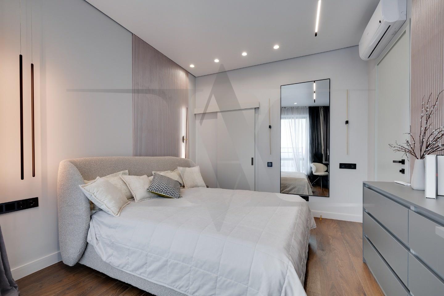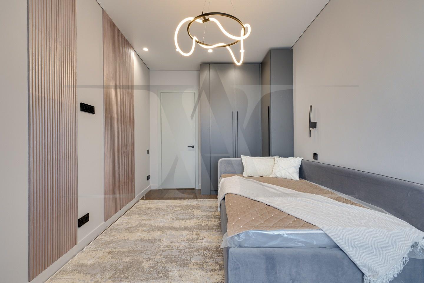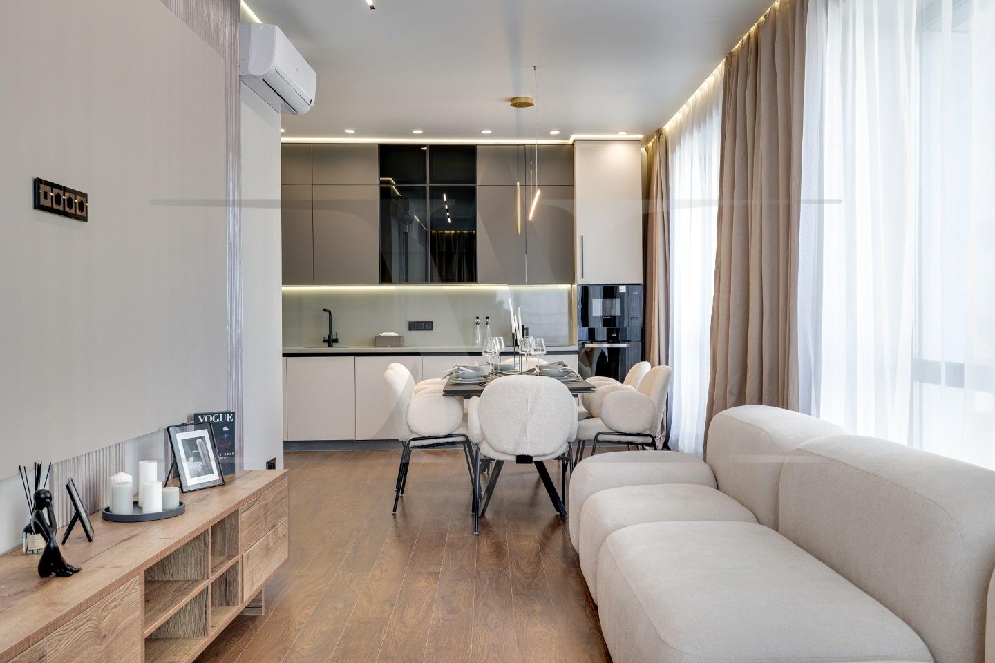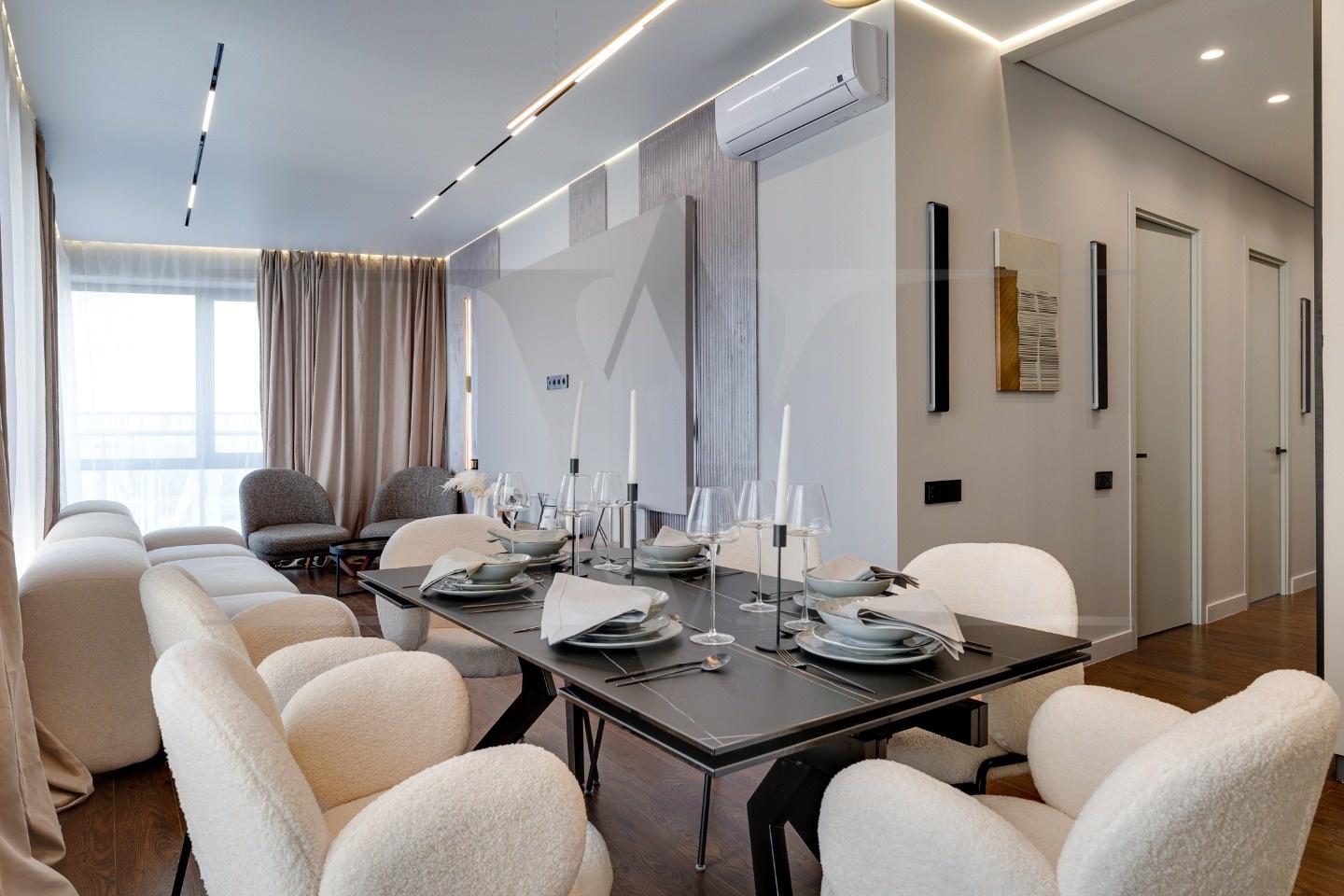 Планировочное решение предусматривает: три изолированные комнаты и кухню-гостиную площадью 30 кв.м., два раздельных санузла, гардеробная. Мебель, техника, кондиционеры, предметы интерьера и текстиля, все входит в стоимость. Бельгийское панорамное остекление.