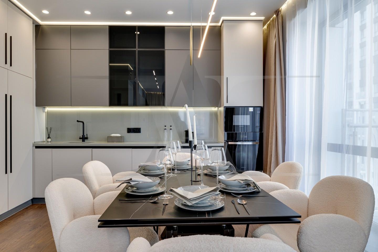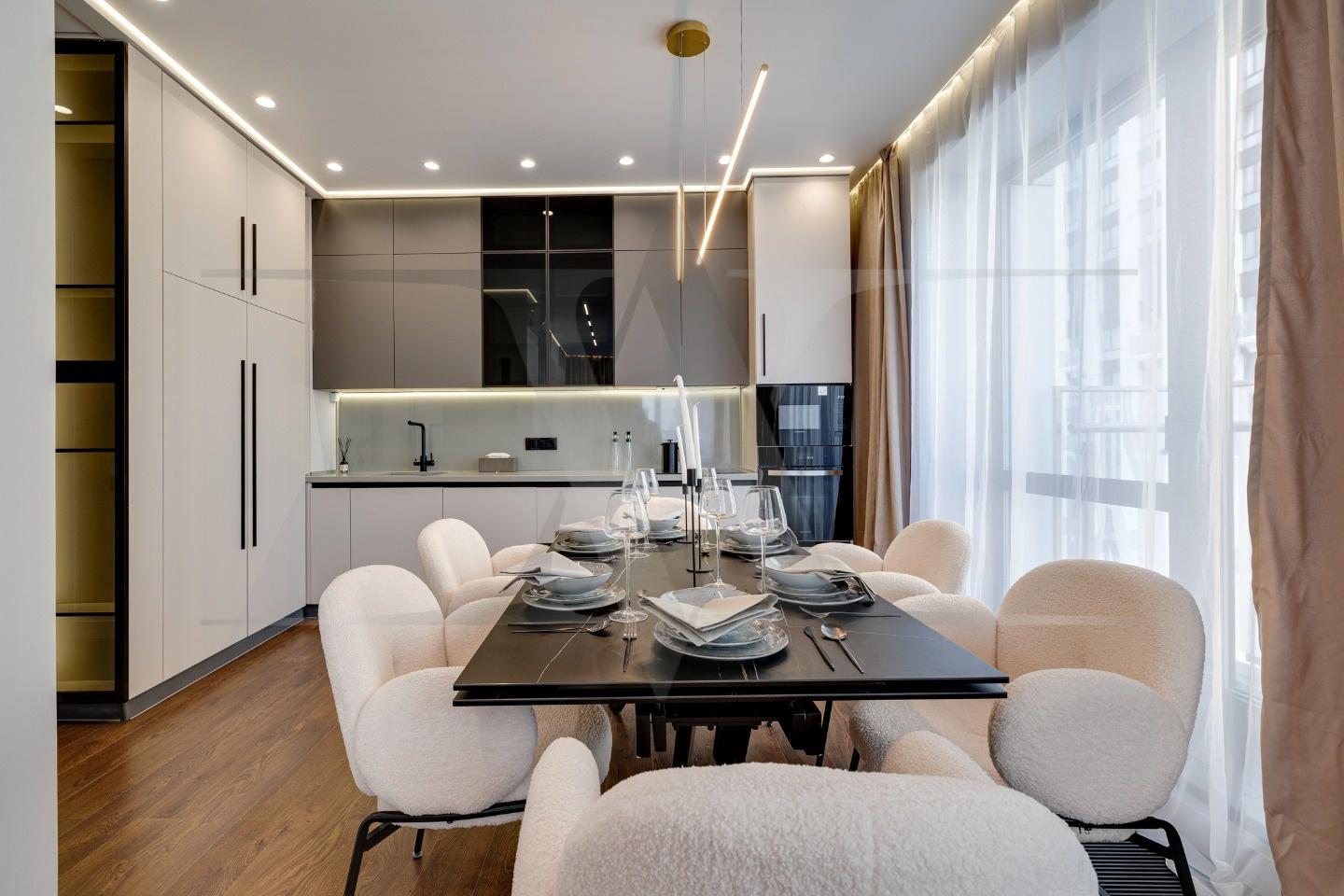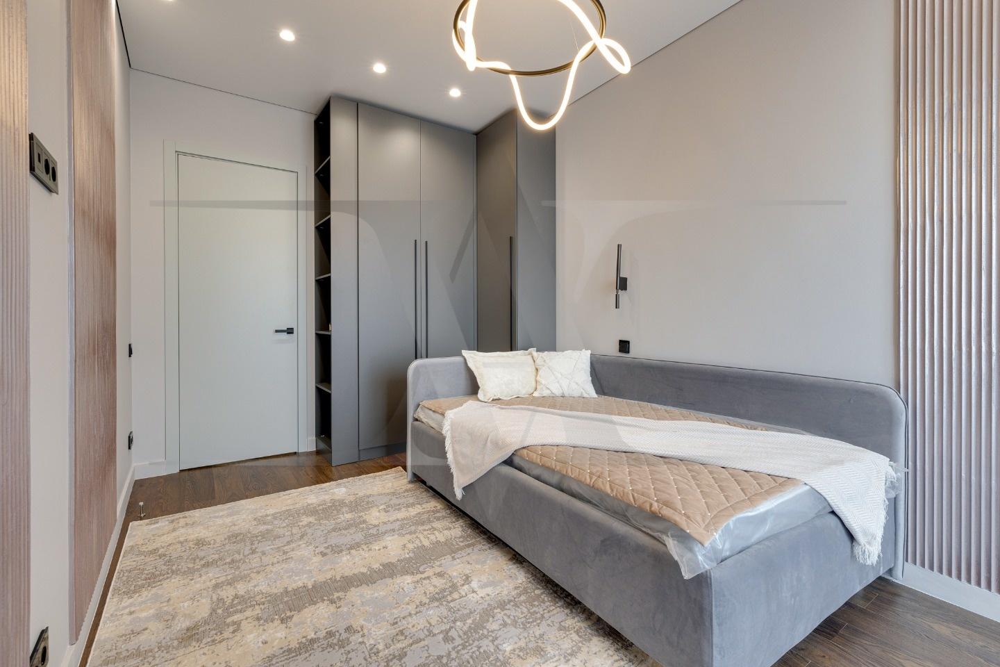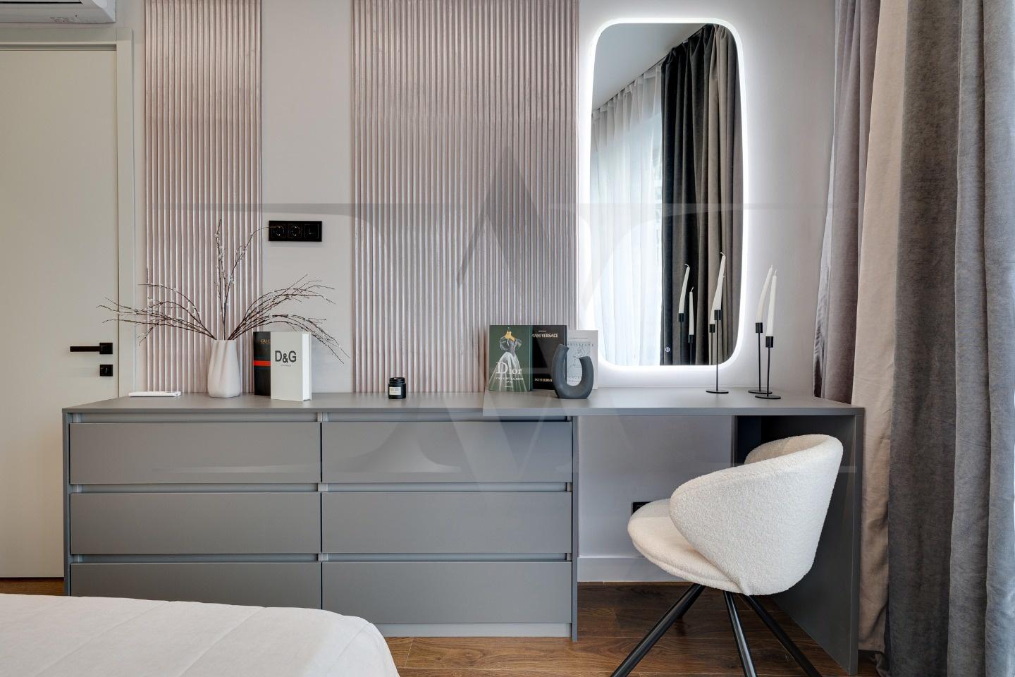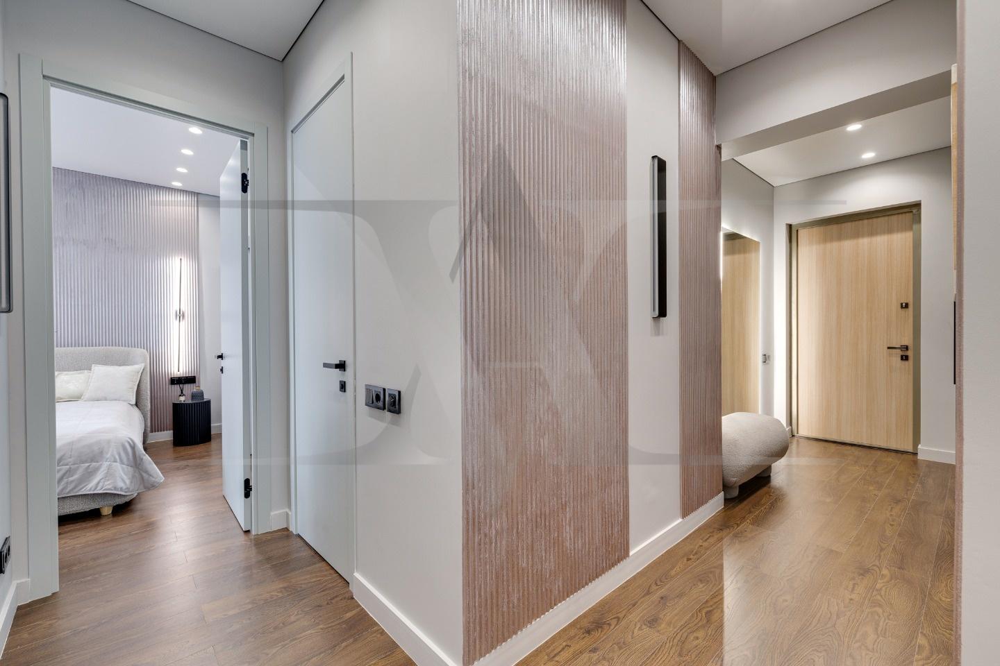 Планировочное решение предусматривает: три изолированные комнаты и кухню-гостиную площадью 30 кв.м., два раздельных санузла, гардеробная. Мебель, техника, кондиционеры, предметы интерьера и текстиля, все входит в стоимость. Бельгийское панорамное остекление.