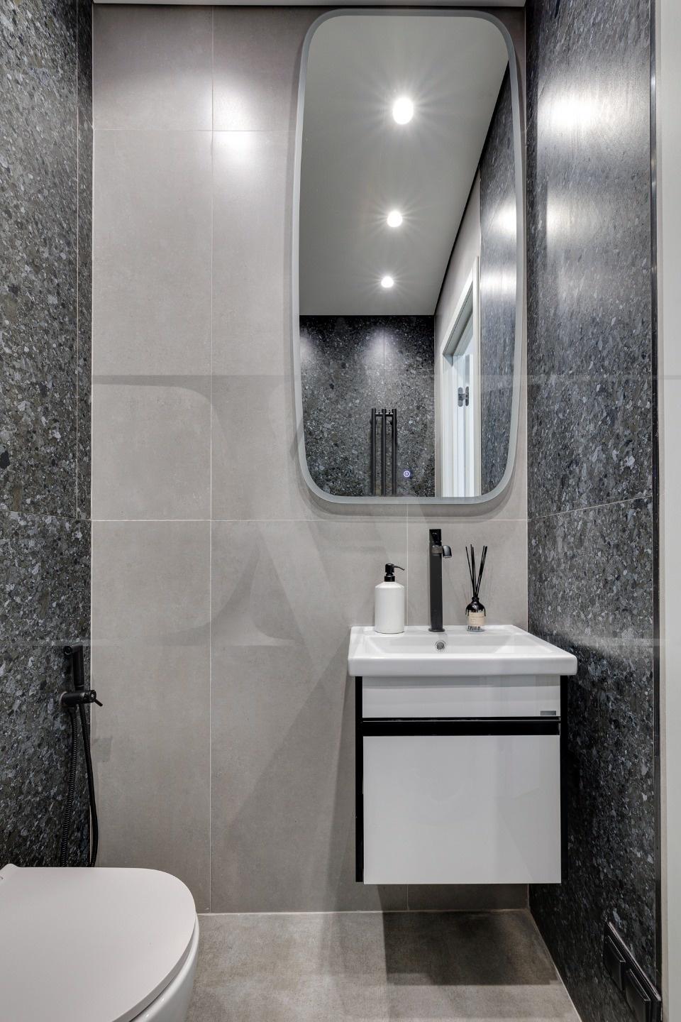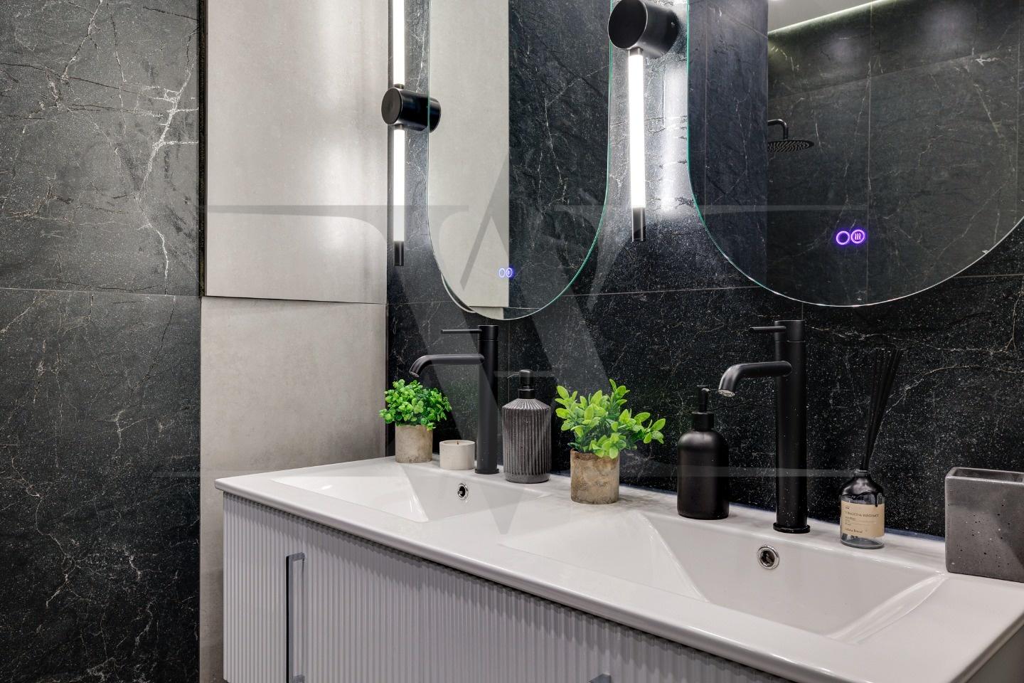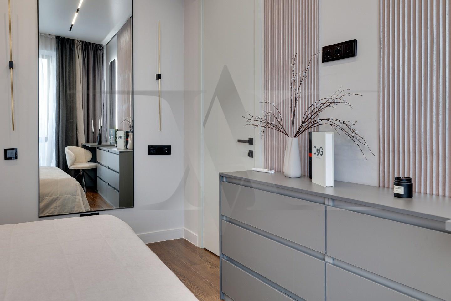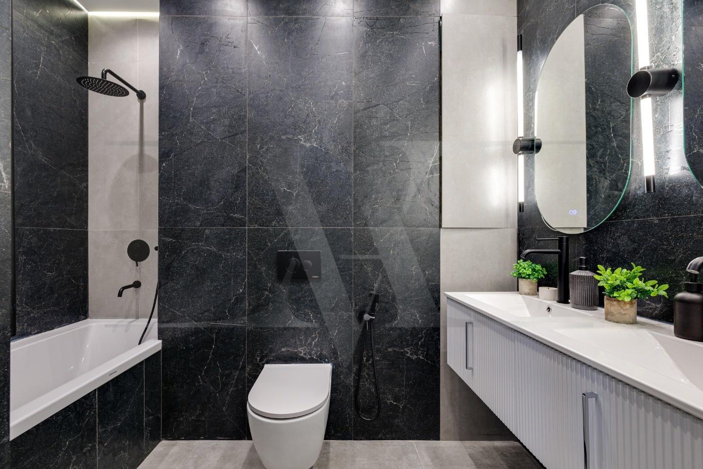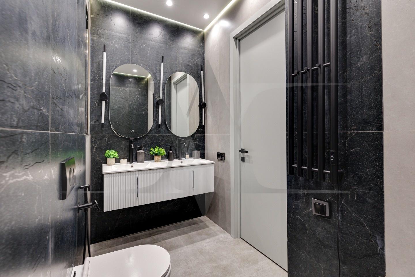 Планировочное решение предусматривает: три изолированные комнаты и кухню-гостиную площадью 30 кв.м., два раздельных санузла, гардеробная. Мебель, техника, кондиционеры, предметы интерьера и текстиля, все входит в стоимость. Бельгийское панорамное остекление.