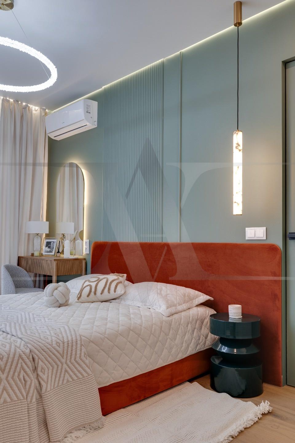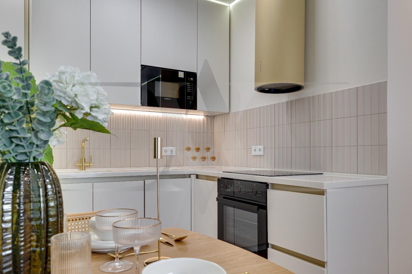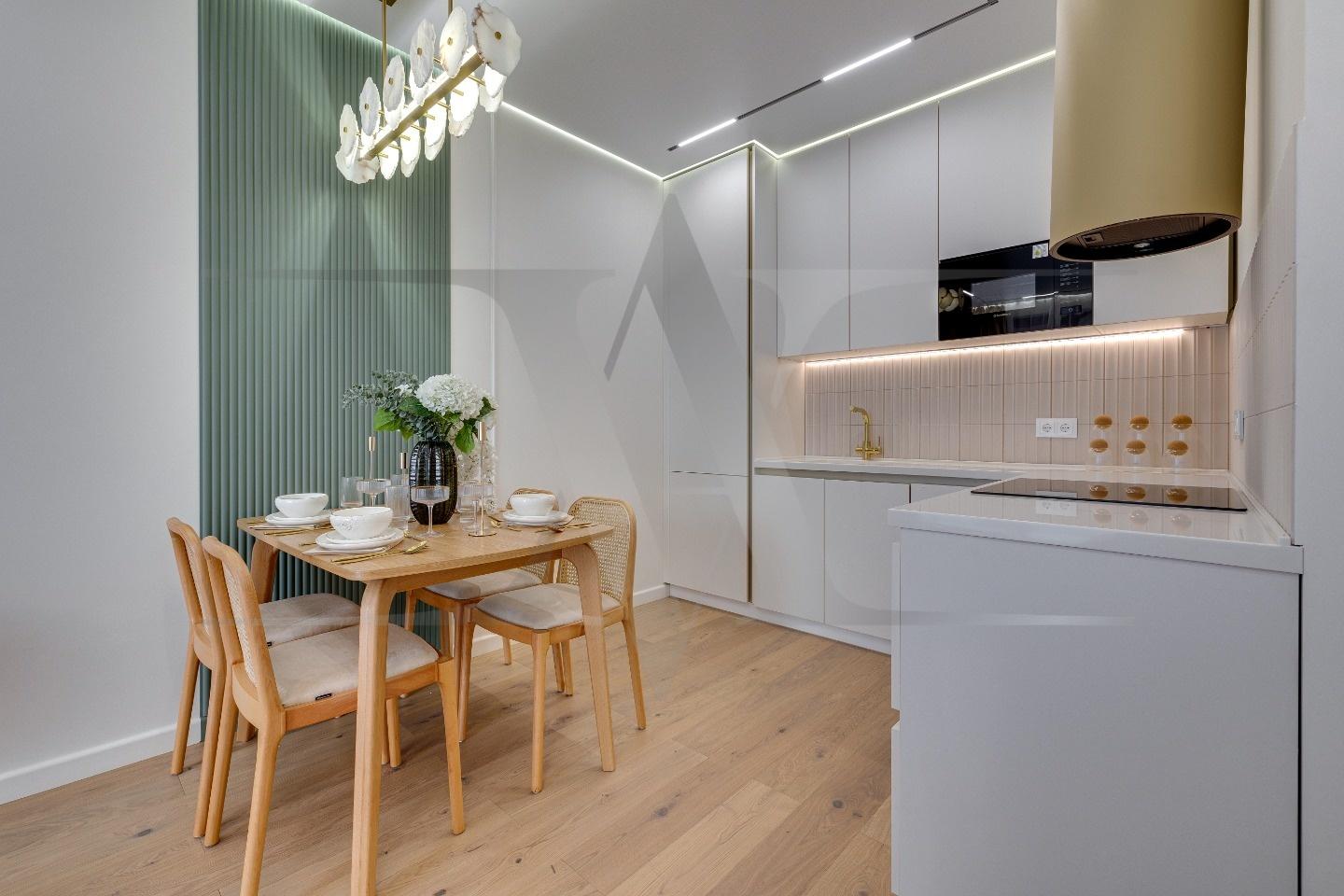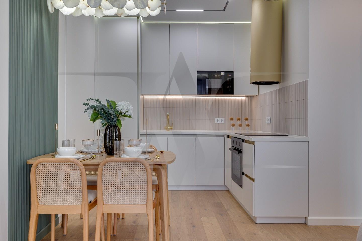 Квартира с новой мебелью, кухонным гарнитуром и техникой. Планировка: кухня-гостинная, две изолированные спальни, два санузла. Высота потолков 3 метра.
