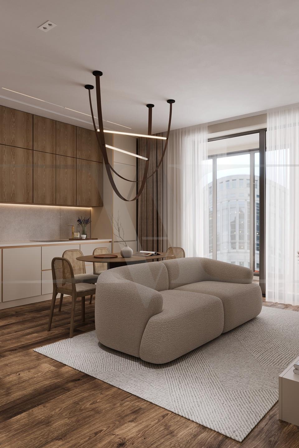 Квартира с новой мебелью, кухонным гарнитуром и техникой. Планировка: кухня-гостиная, три изолированные спальни, два санузла. Высота потолков 3 метра.