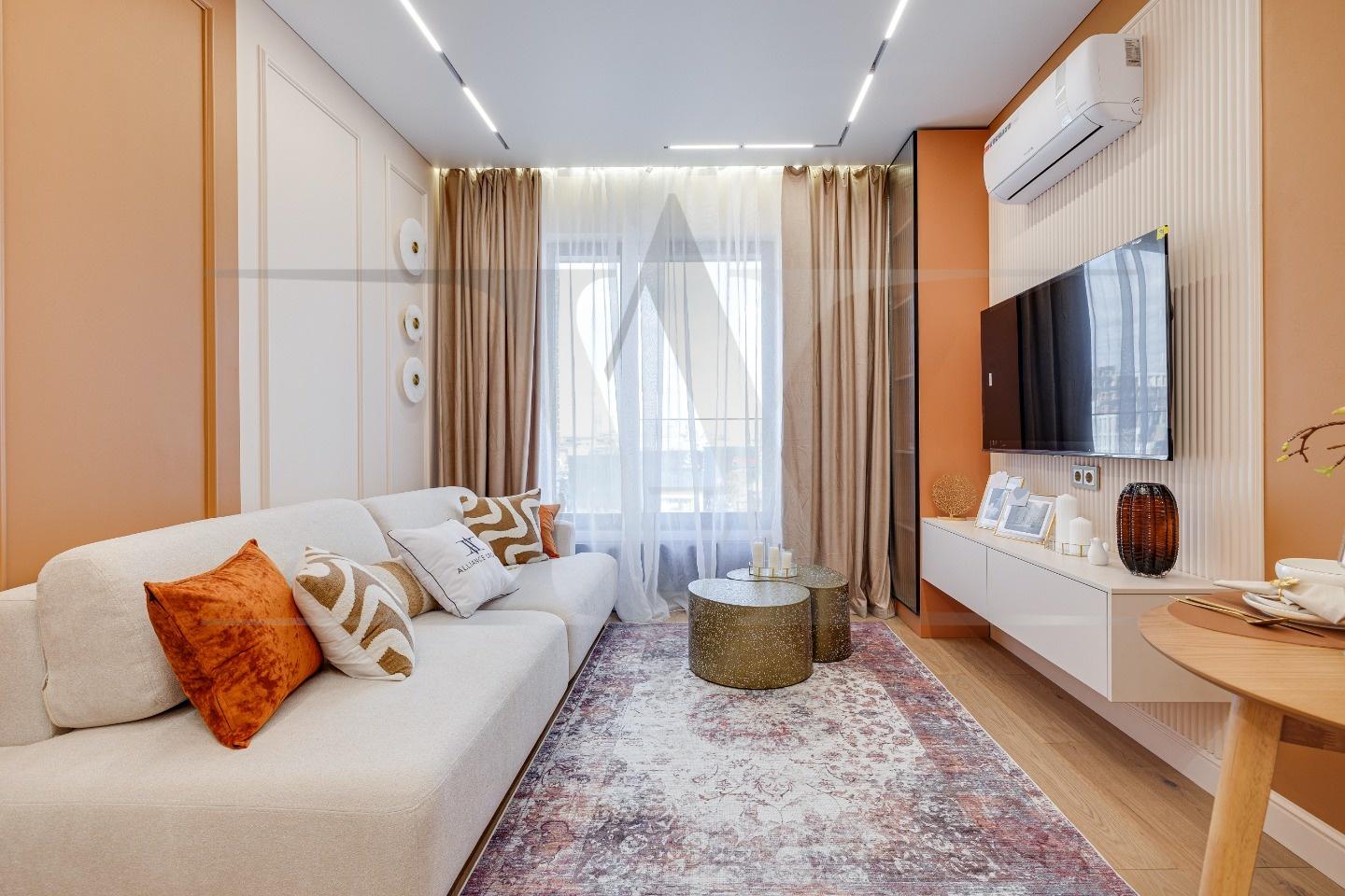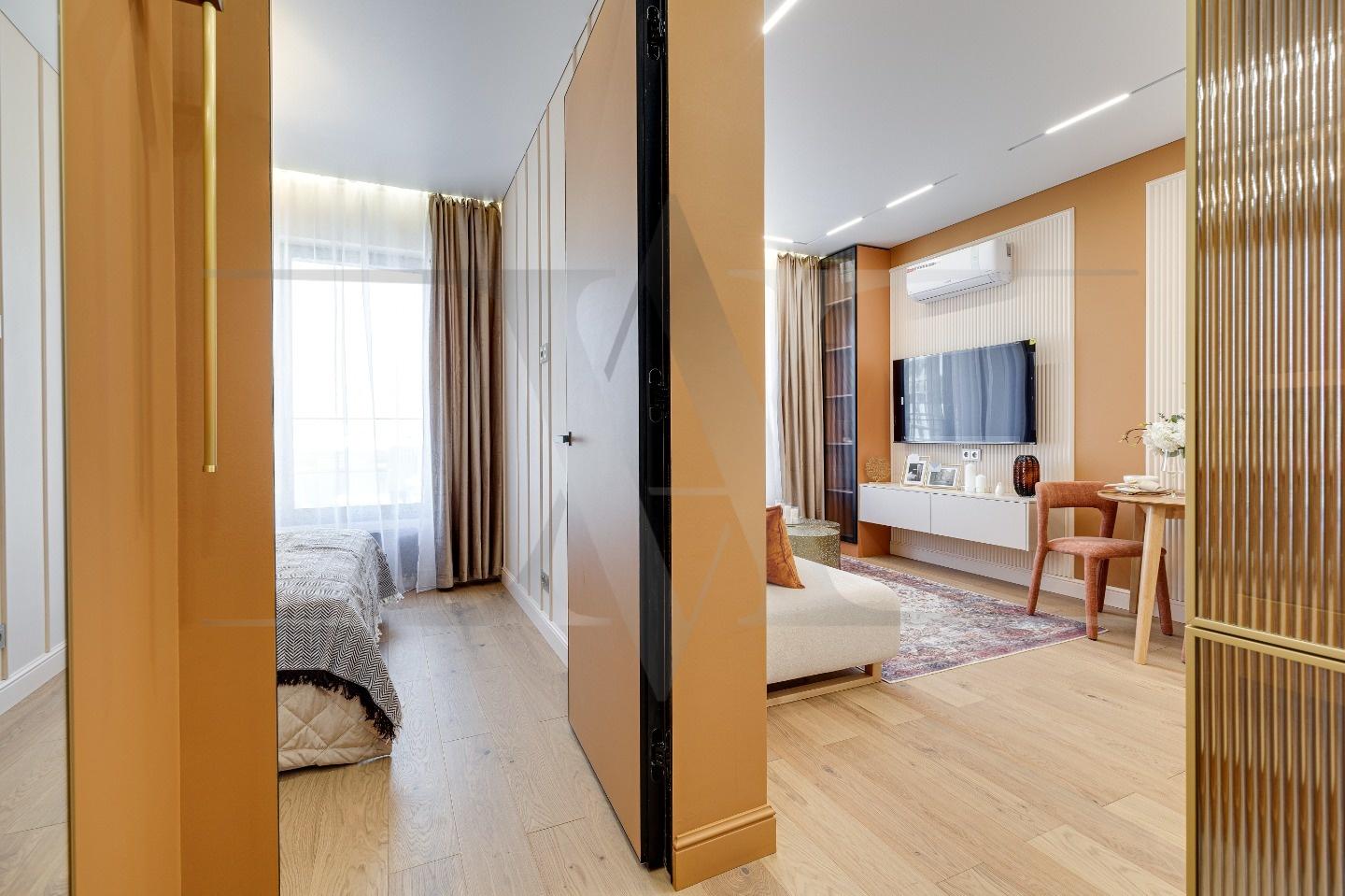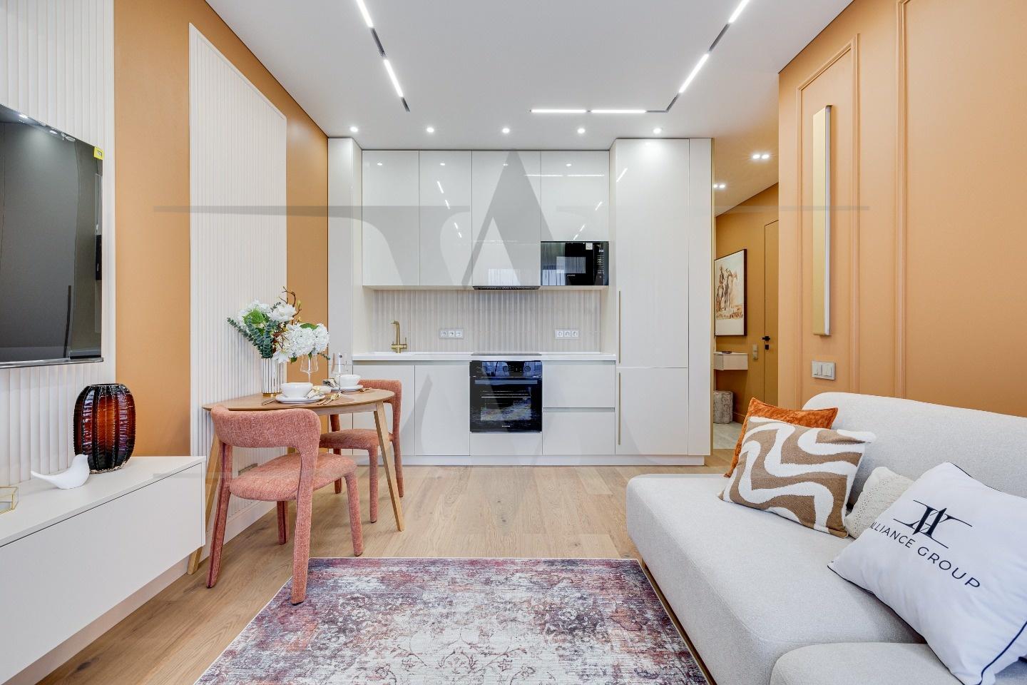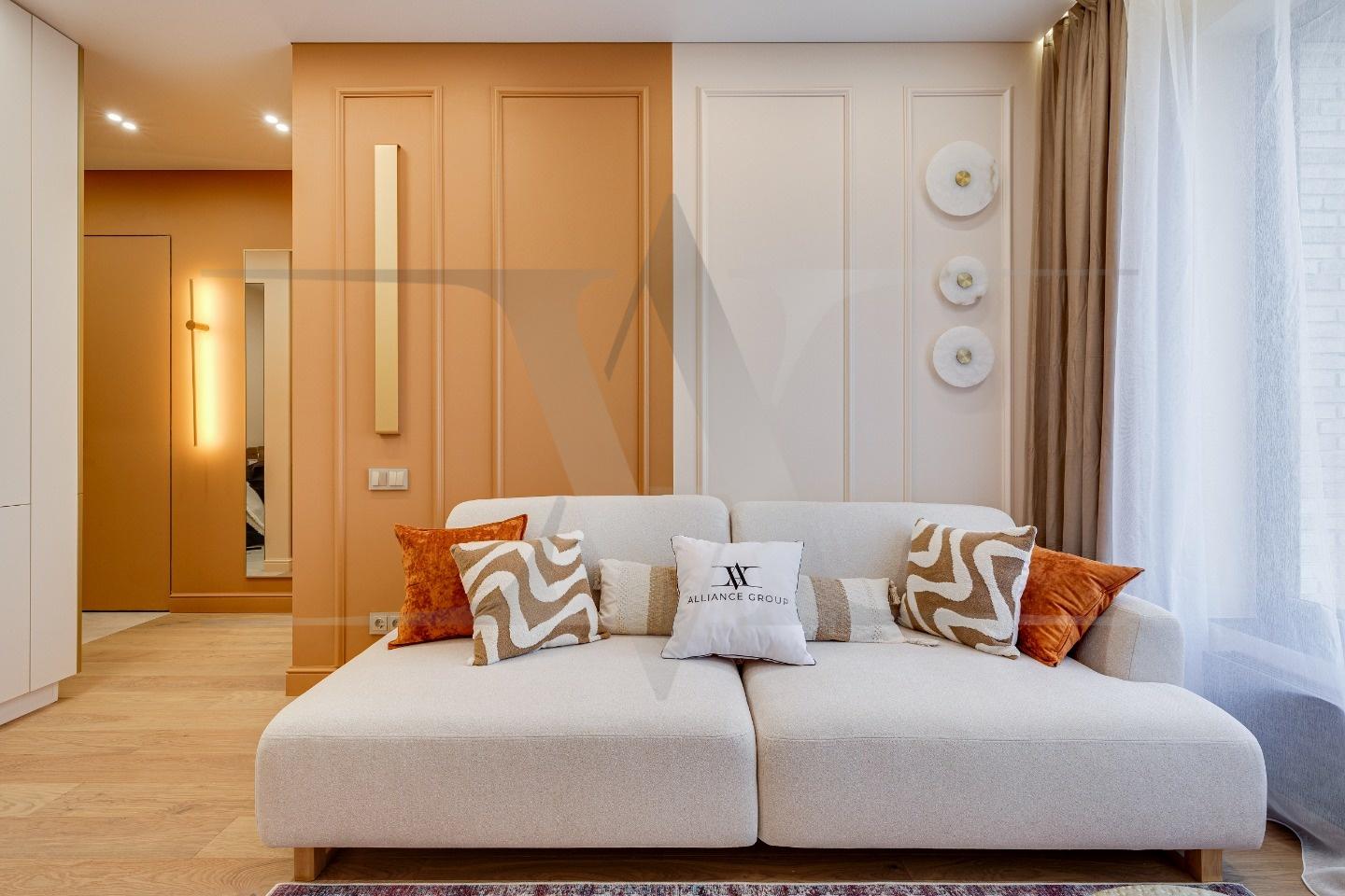 Новая однокомнатная комнатная квартира с просторной кухней гостиной и авторским дизайн-проектом от студии дизайна "Design Alliance". Ремонт квартиры выполнен командой студии «Design Alliance». Начиная от разработки проекта и заканчивая клинингом квартиры всю работу по созданию вашего идеального жилья берет на себя студия дизайна "Design Alliance".