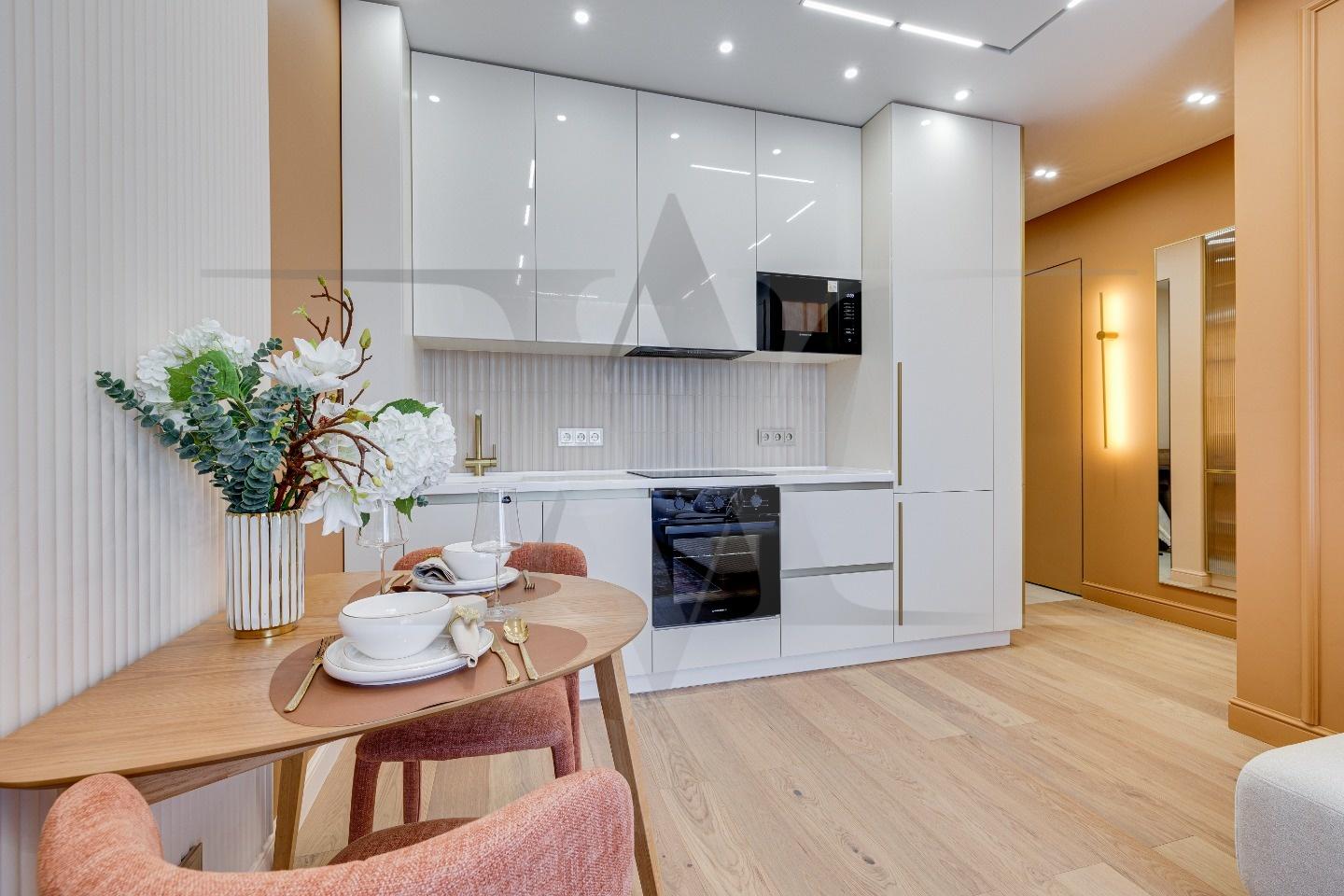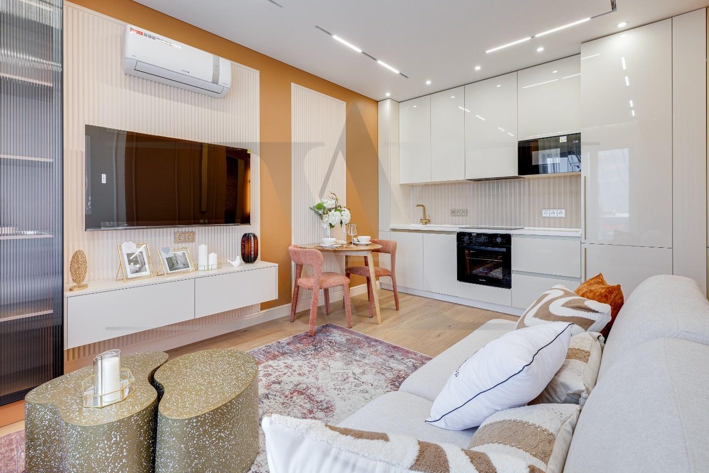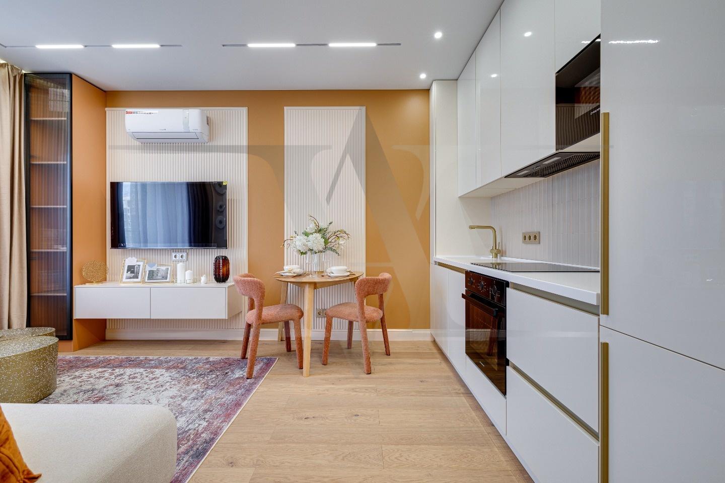 Новая однокомнатная комнатная квартира с просторной кухней гостиной и авторским дизайн-проектом от студии дизайна "Design Alliance". Ремонт квартиры выполнен командой студии «Design Alliance». Начиная от разработки проекта и заканчивая клинингом квартиры всю работу по созданию вашего идеального жилья берет на себя студия дизайна "Design Alliance".
