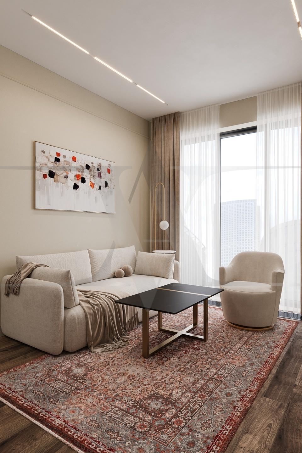 Квартира с новой мебелью, кухонным гарнитуром и техникой. Планировка: кухня-гостиная, изолированная спальня, санузла и гардеробная. Высота потолков 3 метра.