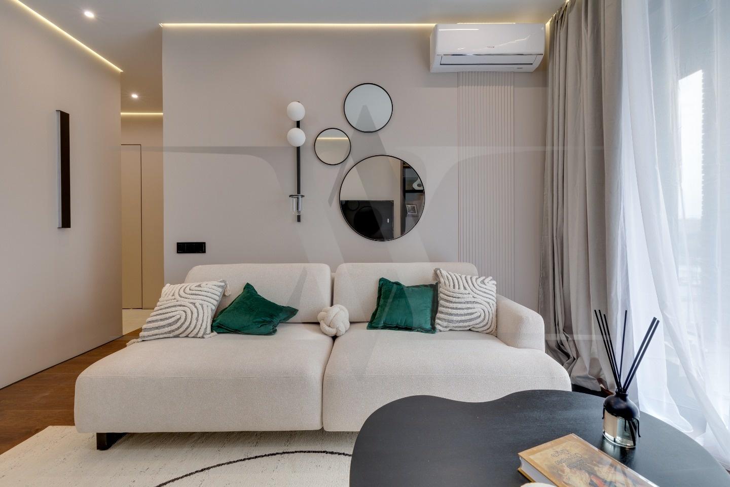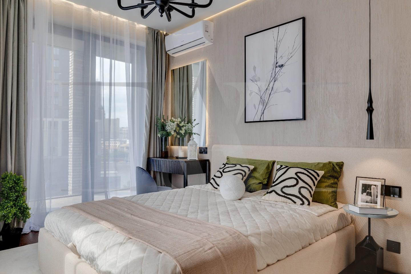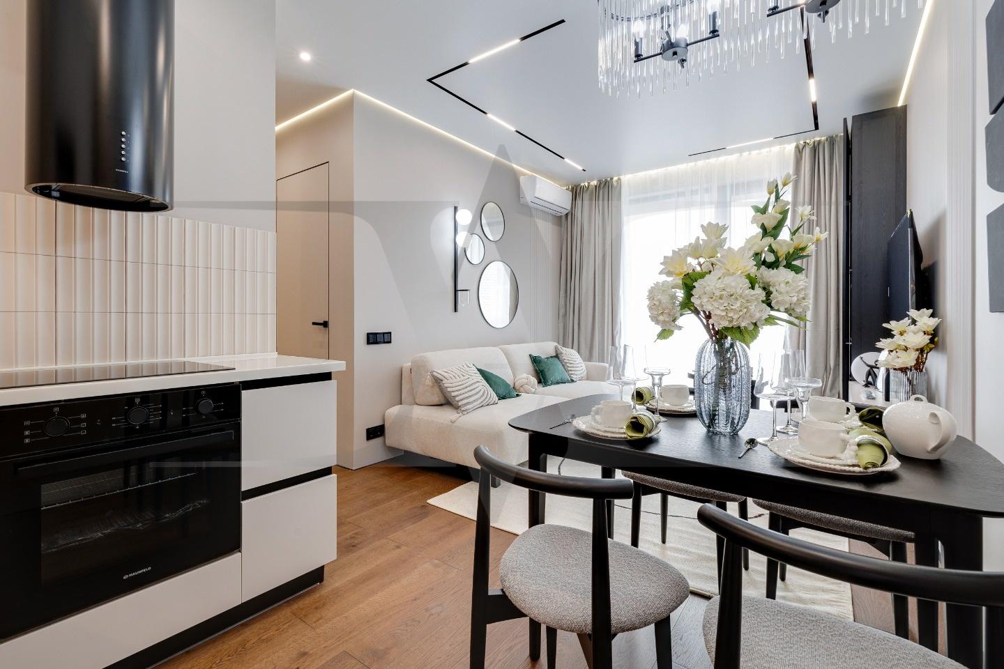 Квартира с новой мебелью, кухонным гарнитуром и техникой. Планировка: кухня-гостинная, две изолированные спальни, два санузла. Высота потолков 3 метра.