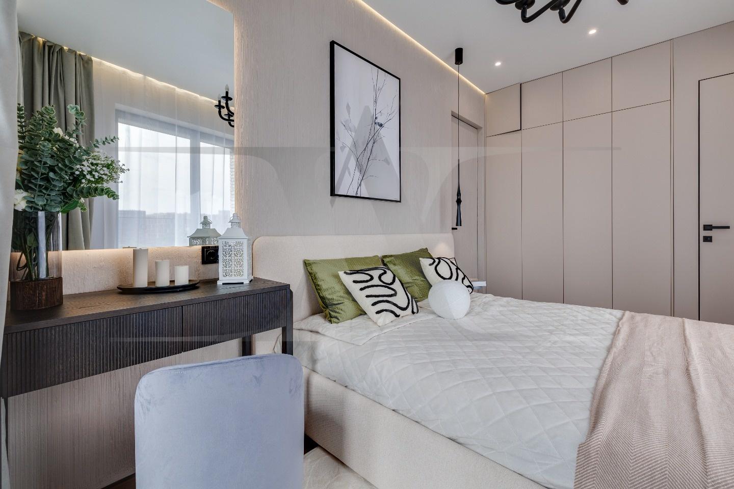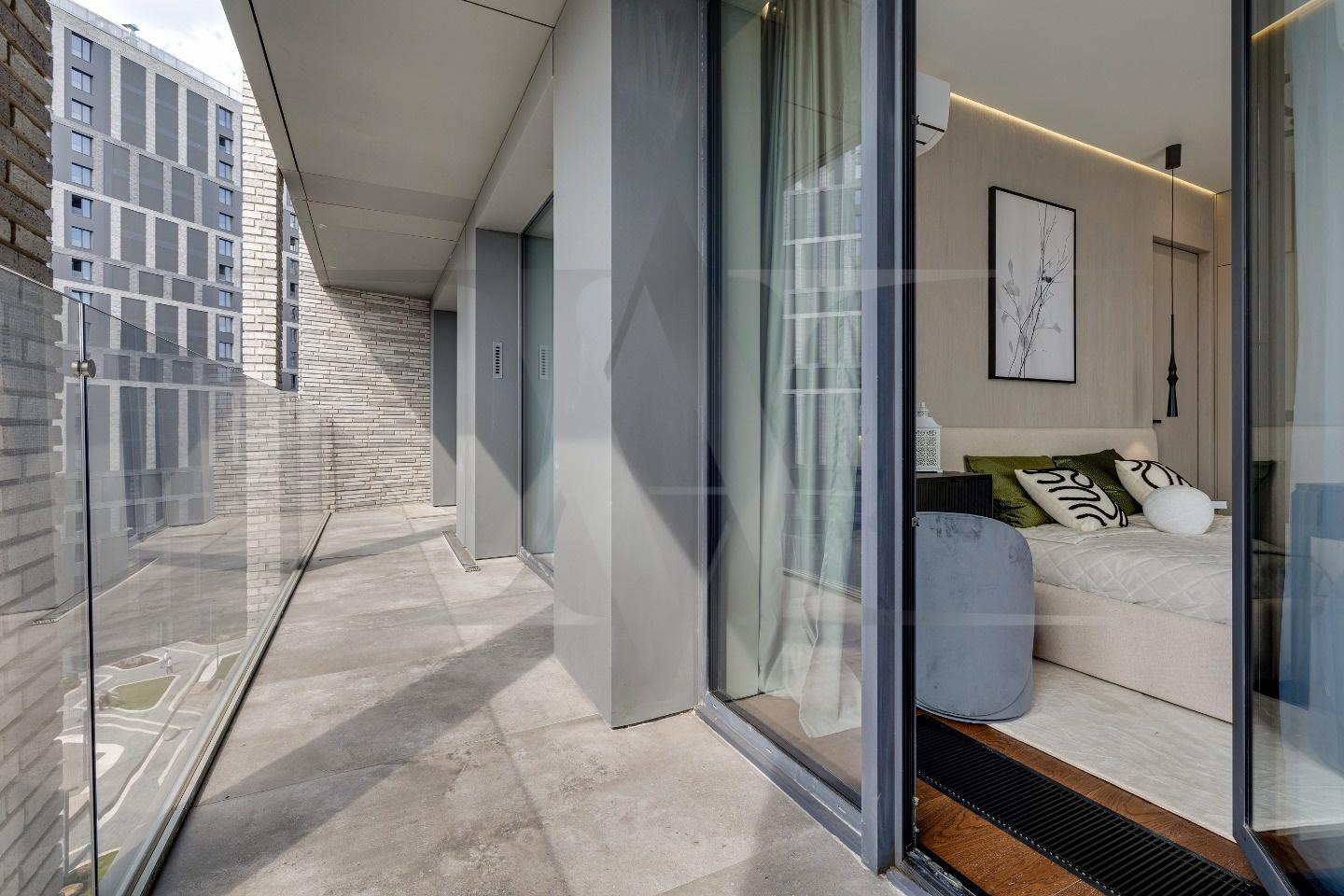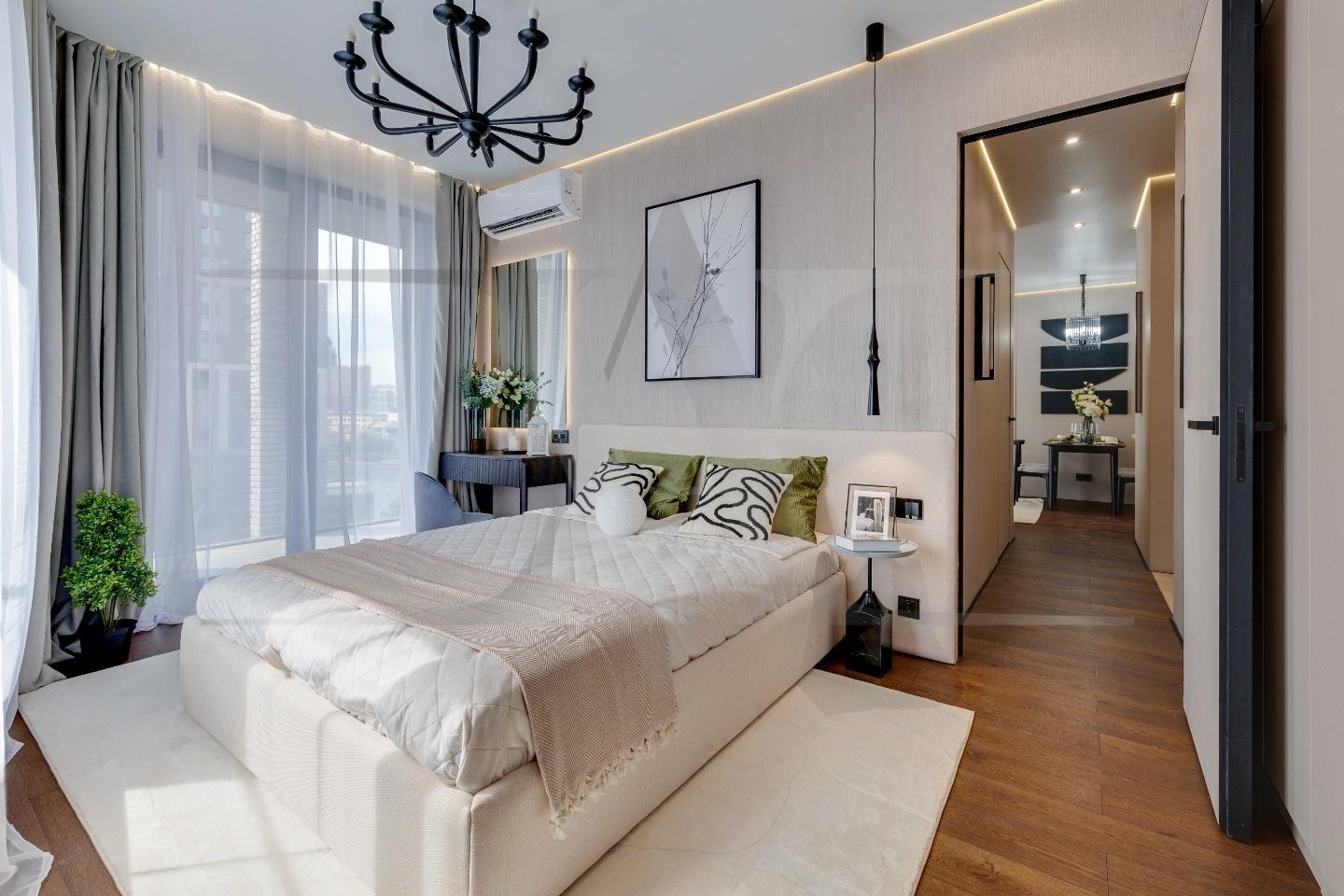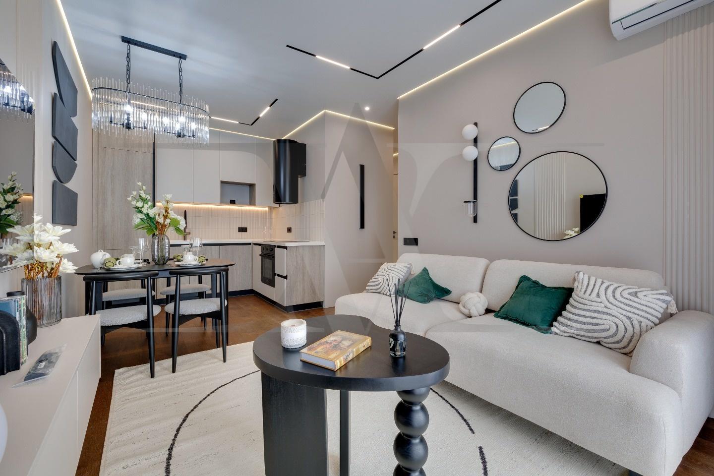 Квартира с новой мебелью, кухонным гарнитуром и техникой. Планировка: кухня-гостинная, две изолированные спальни, два санузла. Высота потолков 3 метра.