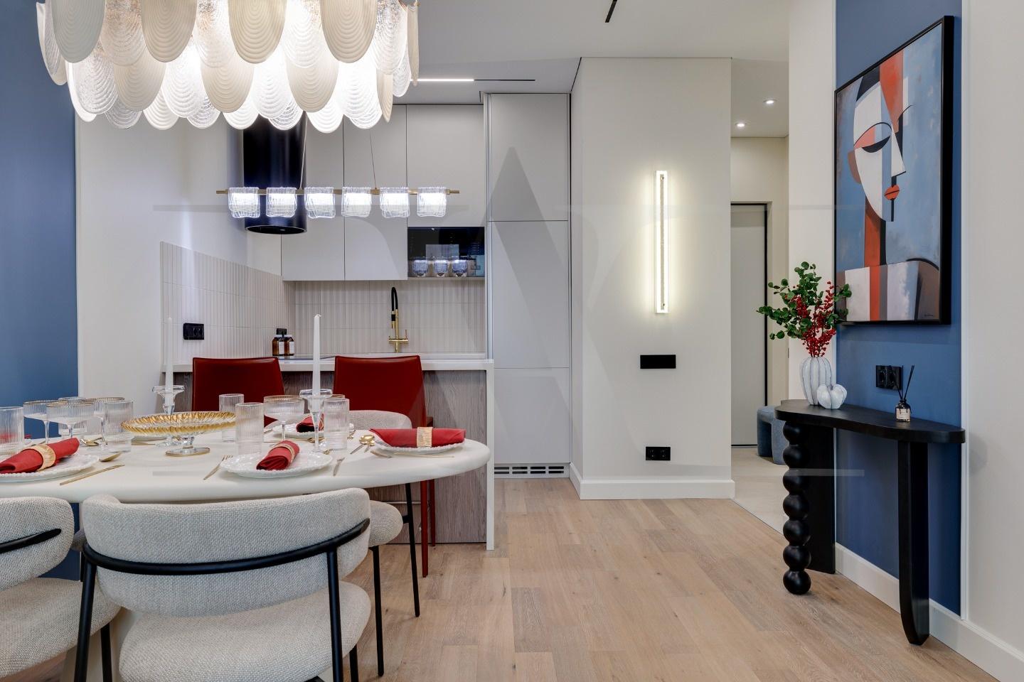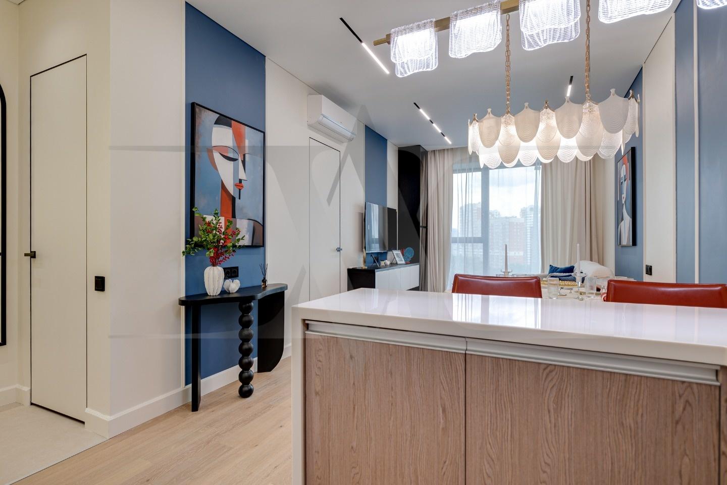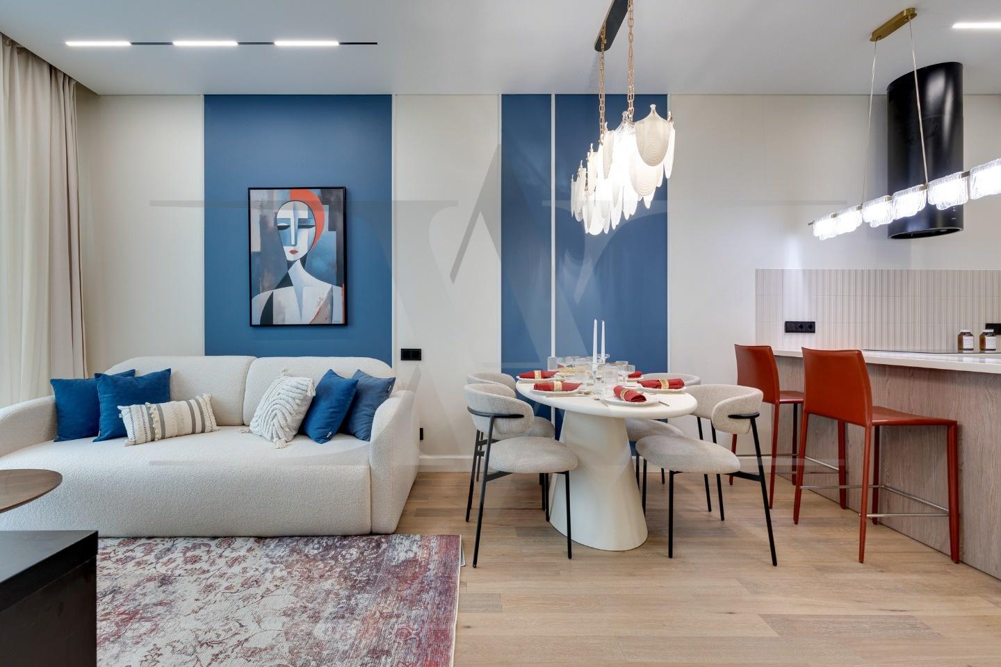 Выполнены несколько сценариев освещения (карнизная подсветка, споты, освещение зоны TV, подшторная подсветка) в которых преобладают люстры итальянского бренда Odeon Light.Новая мебель, кухня с техникой и предметы интерьера входят в стоимость.