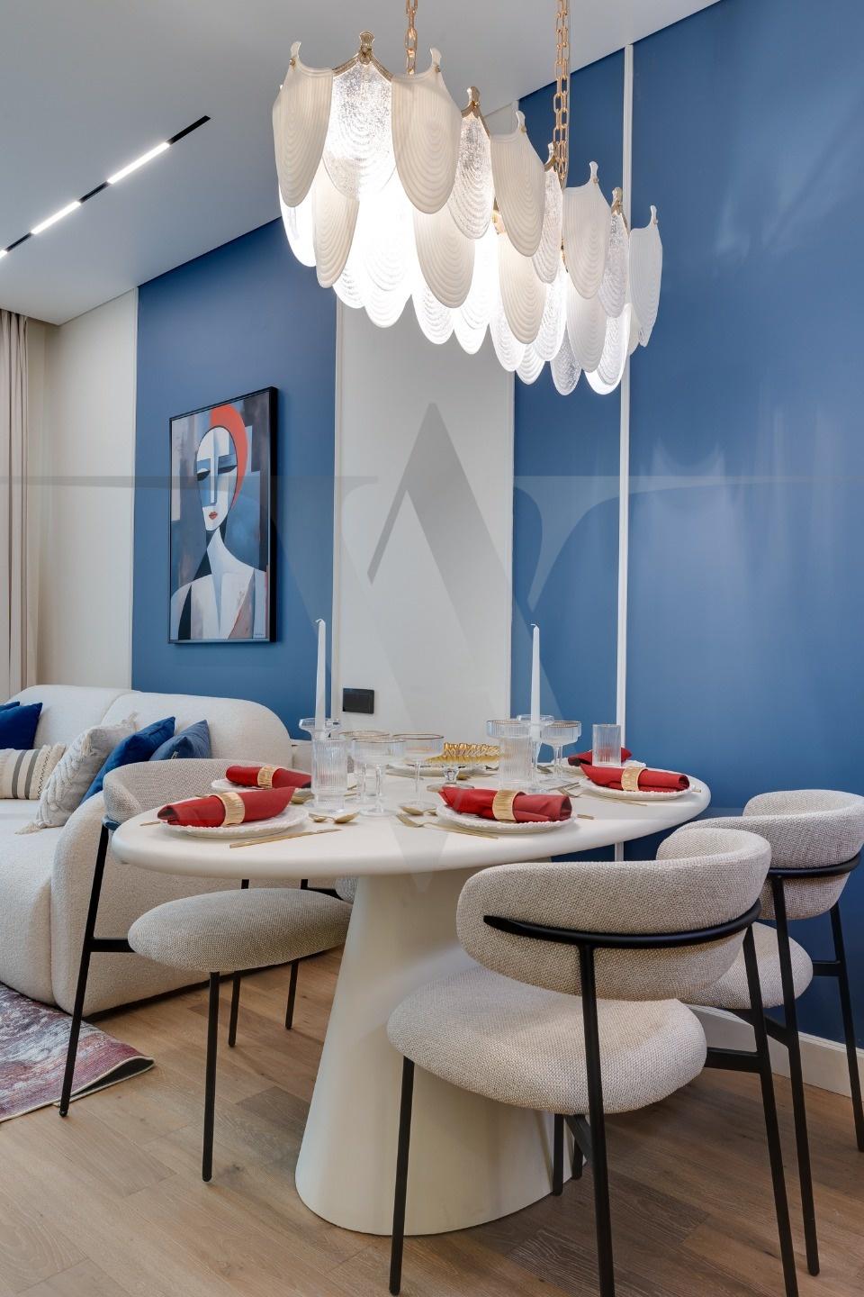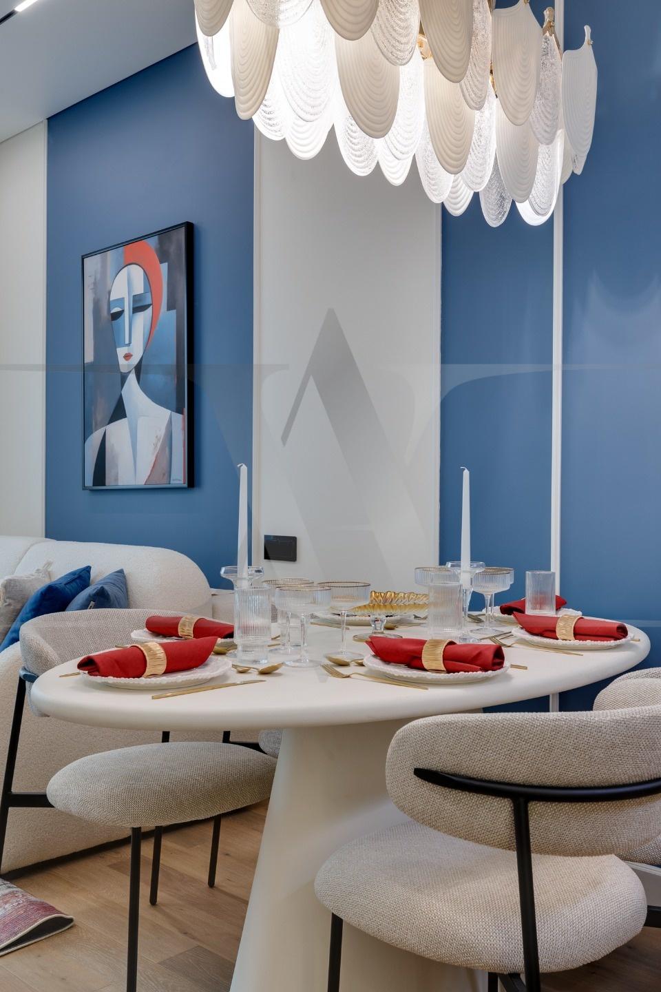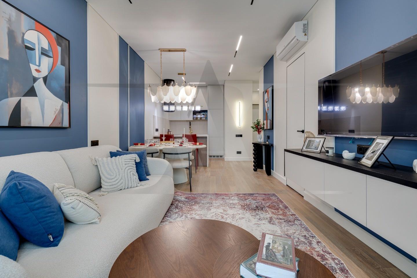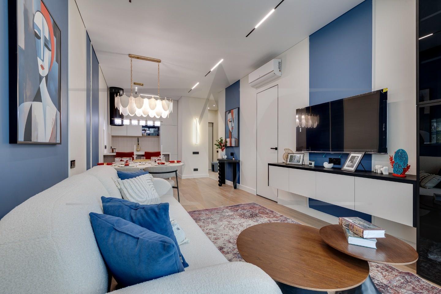 Выполнены несколько сценариев освещения (карнизная подсветка, споты, освещение зоны TV, подшторная подсветка) в которых преобладают люстры итальянского бренда Odeon Light.Новая мебель, кухня с техникой и предметы интерьера входят в стоимость.