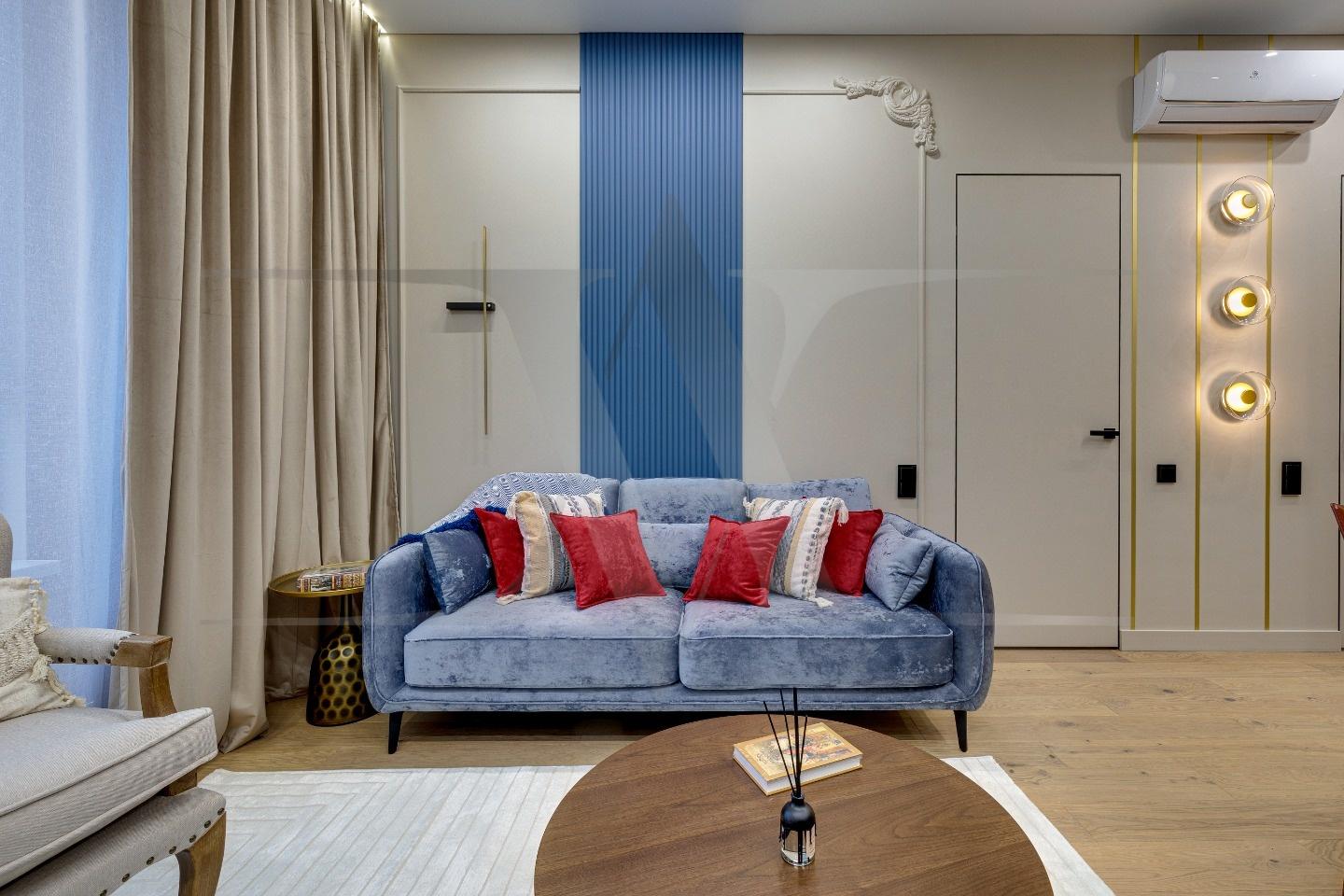 Выполнены несколько сценариев освещения (карнизная подсветка, споты, освещение зоны TV, подшторная подсветка) в которых преобладают люстры итальянского бренда Odeon Light. Новая мебель, кухня с техникой и предметы интерьера входят в стоимость.